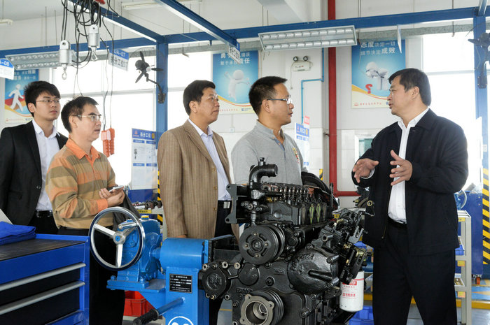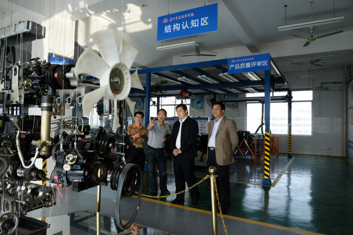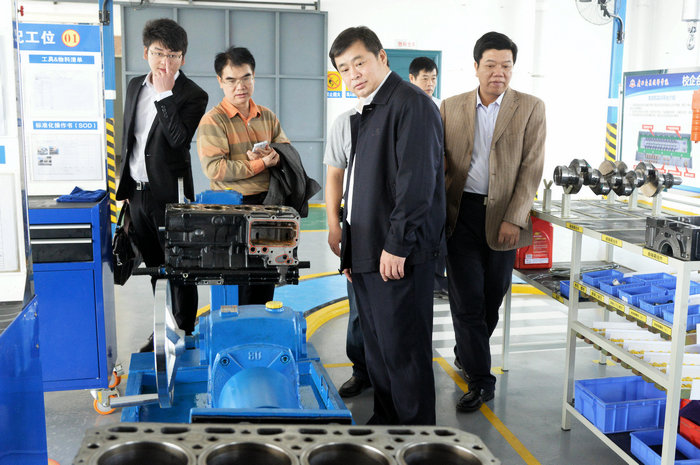 在參觀(guān)汽車實訓基地的過(guò)程中,鍾修仁院長(zhǎng)帶領一行人來(lái)到玉柴(chái)發動機綜合實訓車間。
