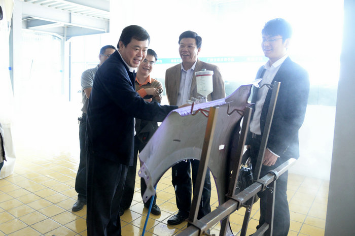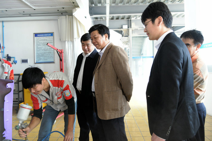 一行人來到鈑噴車間,葉斌書記看到學生們正進行噴塗訓練,饒有興致的拿起噴漆工具進行(háng)了現場指導。