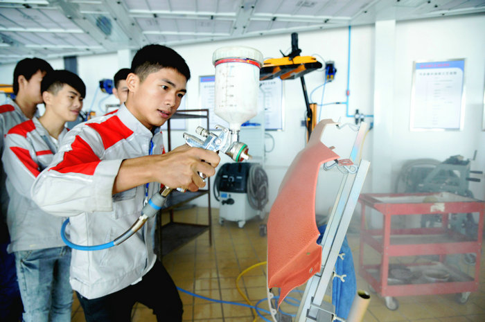 鈑噴車間學生在進行鈑(bǎn)噴基礎訓(xùn)練(一)