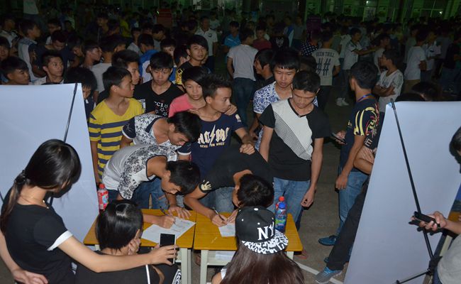 同學們在音樂協會展(zhǎn)位前排隊填寫報名表(biǎo)