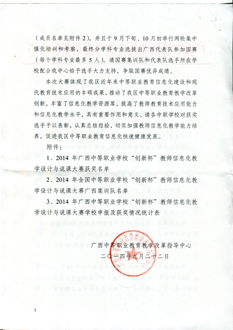 根(gēn)據廣西中等職業教育教學改革指導中心《關於公布2014年廣西中等職(zhí)業學校“創(chuàng)新杯”教師信息化教學設計與說課大賽獲獎名單的通知》(桂中職教改[2014]01號),我院選送的4項教學成果在大賽中獲獎,3位教師入選“汽修類”廣西國賽集訓隊。