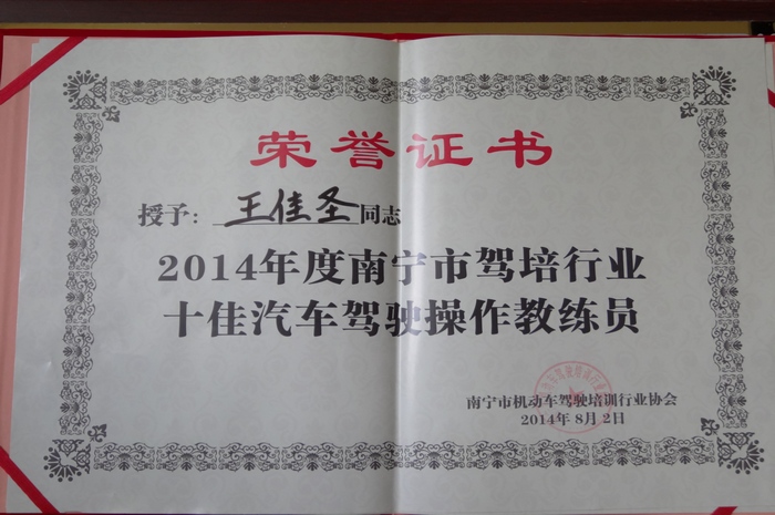 王佳聖榮獲“十佳汽車駕駛操作教練員”證書