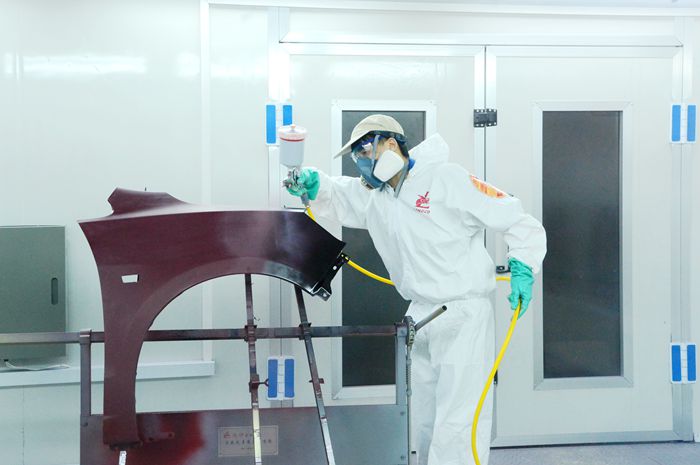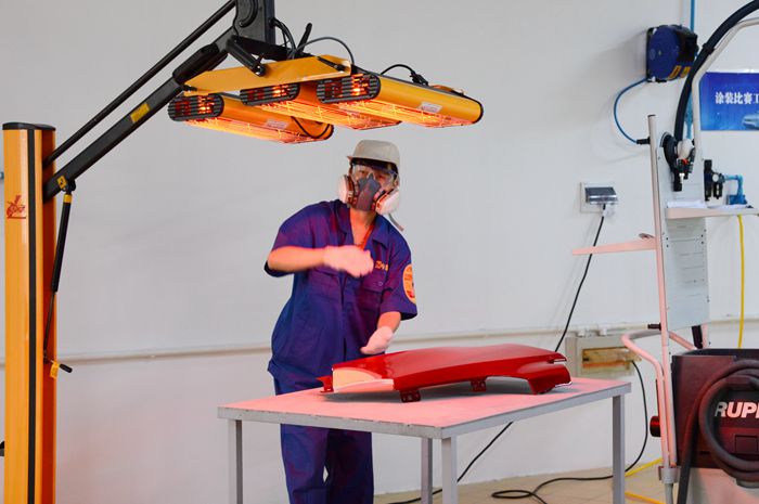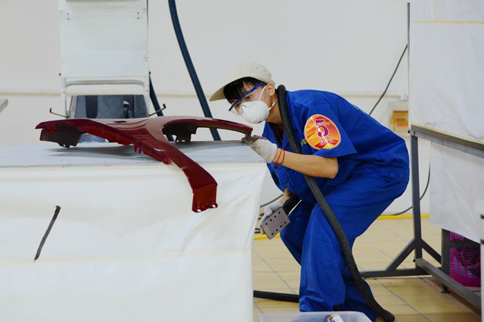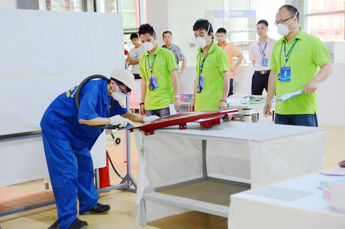 我院選手林劍波(bō)進行汽車塗裝競賽子項目——麵漆噴塗