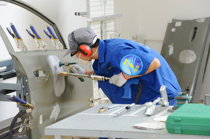 我院選手林劍波進行汽車塗裝競賽子項目——損傷處理