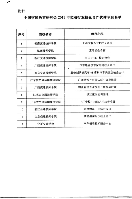 近日(rì),由中國交通(tōng)教育研究(jiū)會組織開展、技工教育分會(huì)承辦“2013年交通行業校企合作優秀項目評選活動圓滿結束(shù),此次活動在(zài)各交通職(zhí)業院(yuàn)校申報的(de)基礎上,組委會對申報材(cái)料進行了嚴(yán)格審查(chá)並組織專(zhuān)家評議,最後在全國技工(gōng)院校範圍內評出了12個項目為“2013年交通行業校企(qǐ)合作優秀(xiù)項目,我院《物流管理專業校企合作發展聯盟》和《汽車鈑金技術保時捷校企合作》項目名列其(qí)中(zhōng)。