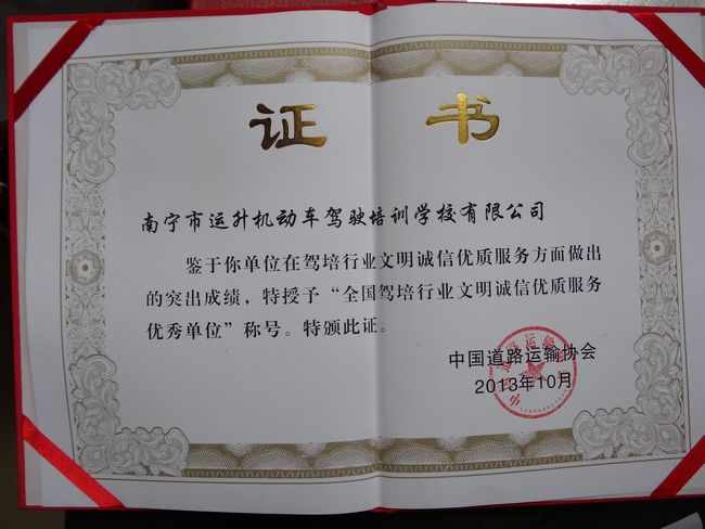 近日,在中國道路運輸(shū)協(xié)會組織創建的“文明誠信、優質(zhì)服務駕(jià)校”主題活動中,南寧市運升駕校(xiào)以優質的服務、規範的管理及(jí)良(liáng)好的口碑喜獲全國“文明誠信、優質服務”優秀單位之殊榮。呂鍇、李鹹康兩位同誌喜獲(huò)得優秀教練員稱號。