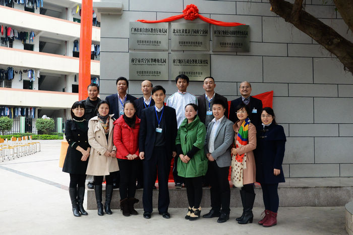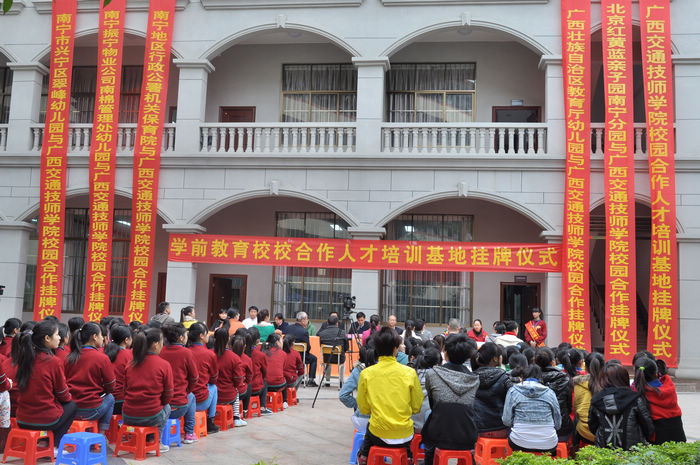 1月8日下午,我院與北京(jīng)紅黃藍親子園南寧分園等五所幼兒園在學(xué)院(yuàn)信息中心大樓前舉行學前教育校校合(hé)作人才培訓基地掛牌儀式。北京紅黃藍親子(zǐ)園南寧分園園長榮輝、副園長黃(huáng)程,南寧(níng)地區行政公署機關保育院副院(yuàn)長趙湘(xiāng)燕、主任黃小玉,南寧振(zhèn)寧物業公司南(nán)棉管理處幼兒園園長農瑜,南(nán)寧市興寧區翠峰幼兒園園長梁圓(yuán)鸚、書記馮可鳴、業務副園(yuán)長韋喜平等應邀參加了儀式。學院院長韋(wéi)紅教(jiāo),黨委書(shū)記羅華,副院長鍾修仁以及相關部(bù)門主要負責(zé)人和專業教師等(děng)出席了儀式。儀式由鍾修仁副院長主持。