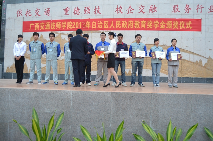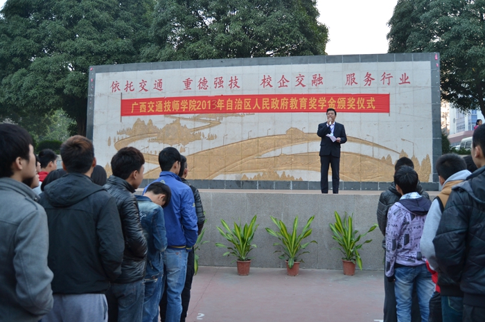 2013年12月2日(rì)早上,2013年度自治區人民政府教育獎學金頒獎儀式在我院燈光球場隆(lóng)重(chóng)舉行,儀式由我院學生工作處副主任梁勇主持。學院副院長鍾修仁(rén)出席儀式並致辭(cí),學生(shēng)工作處領導和全體幹事、各班主任及在校班級全(quán)體學生參加了儀式。全院共有113名學(xué)生榮獲2013年度(dù)自治區人民政府教育獎學金(每人2000元),共計22.6萬元人民幣。