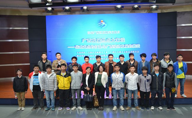 11月14日下午,我院師生代表30人在團委書記李薑春(chūn)老師的帶領下,來到自治區遠程辦演播室參加了“廣西發展熱點大家談”活動(dòng)。自治區人大教育科學(xué)文化(huà)衛生委員會主(zhǔ)任委員(yuán)劉樹森,自治區人力資源和社會保障(zhàng)廳黨組書記、廳長蔣明紅(hóng),廣西社會科學黨組書記、院長呂餘生作為嘉賓出席,自治區直屬機關領導及各廳級單位的代表參加,自治區(qū)發改委外資處副處長榮毅宏主持了此次活動。活動由“主持人問、嘉賓談”,“觀眾問(wèn)、嘉賓談”和“主持人問、觀眾(zhòng)談”三個環節組成。活(huó)動一開始,嘉賓們就打造廣西在西南中南地區開放發展新的戰略支點的用意和內涵、如何打造廣西戰略支點及目前廣西成為戰略支點所麵臨的困(kùn)難三個問題進行了暢談;接著,現場觀眾(zhòng)從經濟(jì)發展機製、環境保護問(wèn)題和人才引進政策三方麵向專家提出了問題;最後現場(chǎng)觀眾就主持人提出的“為了實現廣西在全國的戰略地位,還有哪些需要重點關注和加強(qiáng)的領域(yù)?”這個問題交流(liú)了自(zì)己的看法。
