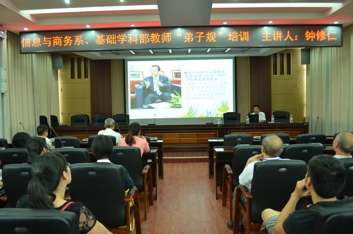 學習和踐行《弟子規》是(shì)我院的德育教育工作的特色,是國家示範校建(jiàn)設中(zhōng)特色項目(mù)的內容。10月16日,我院信息與商務係、基礎學科部的全體老師在信息中心會議室進行《弟子規》傳統(tǒng)文化(huà)學習,由(yóu)學院副院長、《弟子規》講師團團(tuán)長鍾修仁(rén)主講。