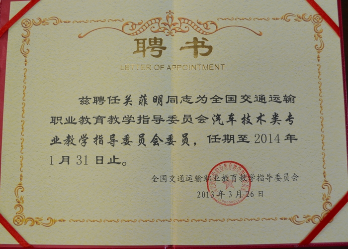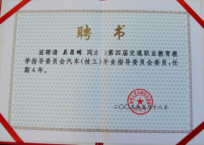 圖二:關菲明副院長2005年榮(róng)任交通運(yùn)輸職業教育(yù)教學指導委員會委員的聘書