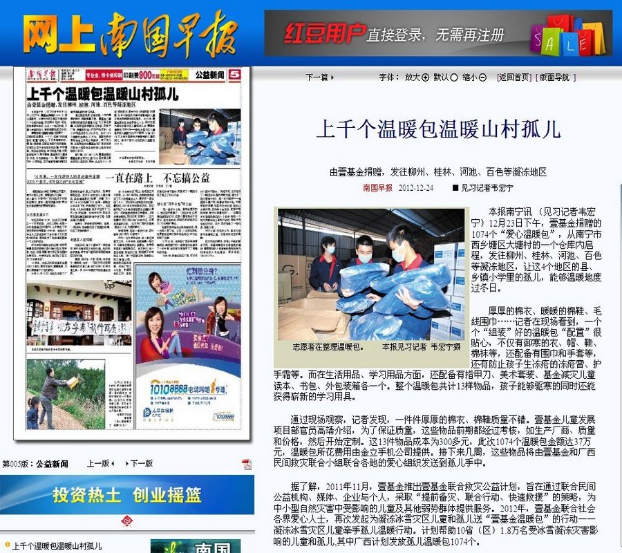 2012.12.24南國早報刊登了我院誌願者參加溫(wēn)暖山村孤兒的送溫暖包活動