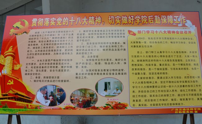 圖9:後勤服務(wù)處展板——貫徹落實黨的十(shí)八大精神 切實做好學院後勤保障工作