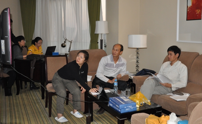 圖(tú)二:答辯工作組成員在北京金碼大酒店認(rèn)真(zhēn)準備答辯(biàn)資料、模擬演練答辯