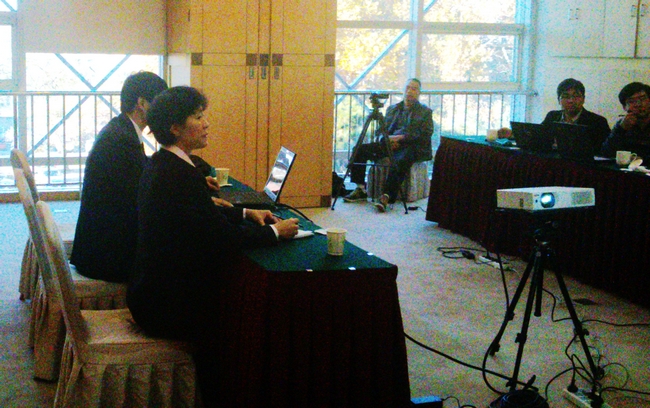 圖四:韋紅教(jiāo)院長在答辯現場向專家演(yǎn)示PPT,陳述學院的建設方案
