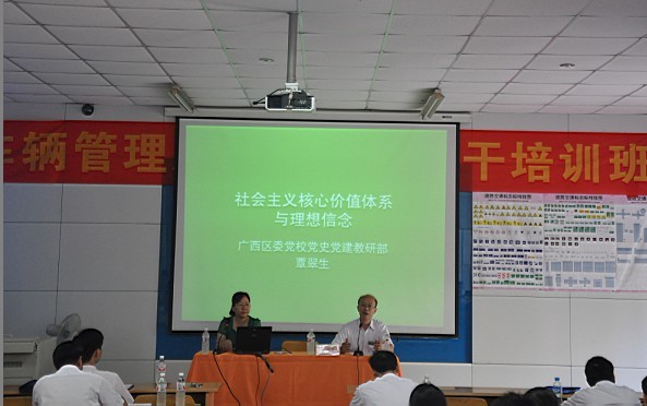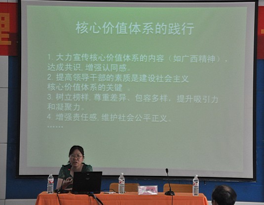 6月18日上午,我校召開黨委中心組2012年第二次集中(擴大)學習(xí)會。廣西區委黨校黨史黨建教研部覃翠(cuì)生教授到會做了(le)題為(wéi)《社會主義核心價值體係與理想信念》的授課指導。會議由羅華書記主持,校(xiào)長韋紅教、副校長陸(lù)天雲、鍾修仁、關菲明以(yǐ)及全體教職工出(chū)席了會議。