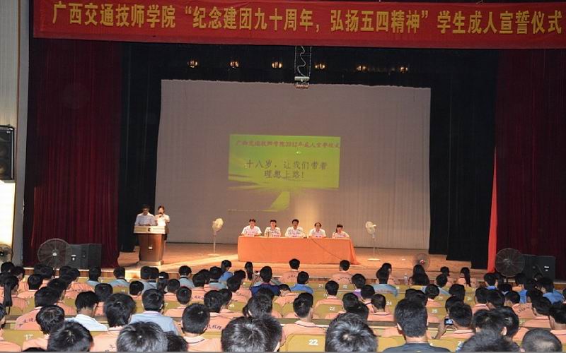 6月7日(rì)下午,我校在校禮堂隆重舉行“紀念建團90周年,弘揚五四精神” 學生(shēng)成人宣誓儀式,千餘名1994年出生的同學右手(shǒu)握拳進行莊嚴宣誓,向社會、向父(fù)母、向(xiàng)老師宣(xuān)告他們已經長大成人。鍾修仁副校長、學工處陸佳副主任、團委的各位老師和各班(bān)級的團(tuán)支書來參加見證儀式,並為同學們送去成人祝(zhù)福。