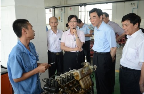 在考察過程中,王(wáng)曉初副部長不時向韋紅教校長詢問在校生高級工和預備技師數量、開展職業技能培(péi)訓、生源(yuán)地分布、畢業生薪酬、新校區建(jiàn)設、校企合作等情況,並興致勃勃地與正在(zài)授課的汽(qì)車(chē)美容中心專業勞一民(mín)老師、汽車商務專(zhuān)業韋(wéi)欣(xīn)烜老師、汽車檢測與維(wéi)修專業的李宣葙、潘莉丹老(lǎo)師、北京現代汽車訂(dìng)單班李春等老師(shī)親切交談,詳細詢問實訓內容、教學方法、教(jiāo)學效果和個人進修培訓情(qíng)況,還與正在進行汽車發動機拆裝檢測的2009級學(xué)生麵對麵交流,了解他們(men)的(de)學(xué)習、實習和生(shēng)活情況。