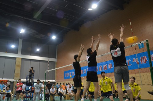 圖九:91.com高級技工學校女子氣排(pái)球隊雙人攔網英姿