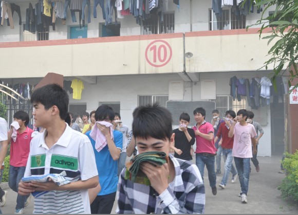 伴隨著警笛的呼嘯聲,演習正式開始。學生宿舍樓(lóu)被“濃煙”籠罩,約三(sān)千(qiān)名學生按照預先講解的疏散路線(xiàn),緊急行(háng)動起來。老師們以最快的速度趕到各個(gè)宿舍樓,迅速組織學生口(kǒu)捂濕毛巾,蹲身弓腰紛紛從樓梯(tī)向(xiàng)指定的安全聚集點(diǎn)疏散。學校護校(xiào)隊的隊員們也立即(jí)來到樓梯(tī)和安全出口等人員疏散集中地點,協助(zhù)引導學生(shēng)疏散。從(cóng)警報響起到全體(tǐ)師生疏散到安全點,並確認人數無誤(wù),總用時約8分鍾。