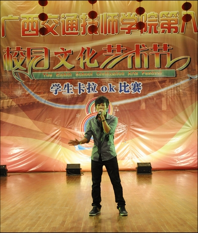 本次校園文化藝術節學生卡(kǎ)拉0K比賽共有130名同學參(cān)與,涉及在校班級75個(gè)。經過3個晚(wǎn)上的預賽,決出李勇聖等12名同學進入決賽。決賽(sài)中一(yī)首首動(dòng)聽的歌曲將我們帶入音樂的海洋,精彩層出不窮(qióng)。最(zuì)終,2010級市場營(yíng)銷班李勇聖同學的《你是我的眼》和2010級(jí)汽車檢測與維修(預備技師)1班梁永超同(tóng)學的《阿(ā)飛的小蝴蝶》榮獲一等獎。
