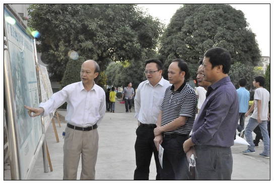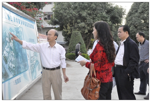圖二 羅華書記向前來參觀的領導介紹學校伊嶺校區規劃圖
