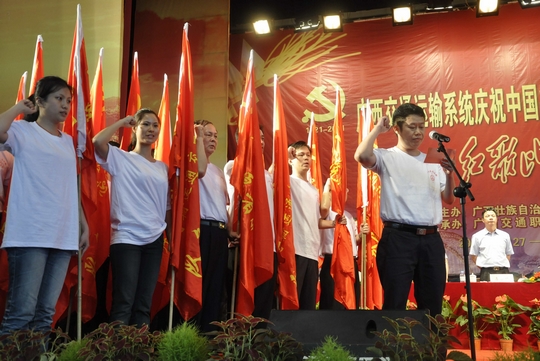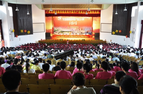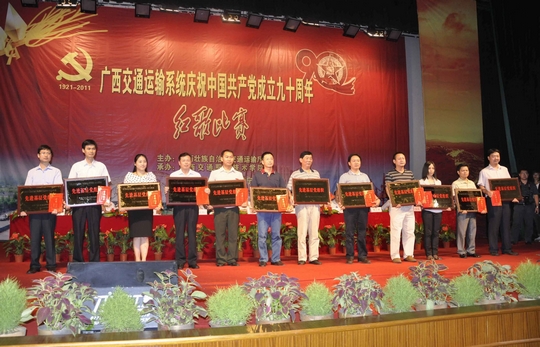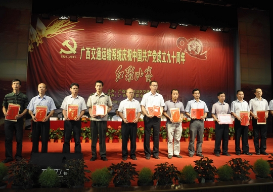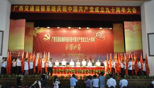 為隆重紀念黨的(de)生日,2011年6月28日上午,自治區交通(tōng)運輸係統慶(qìng)祝中國共產黨成立90周年大(dà)會在91.com職業技術學院禮堂隆重召開。自治區交通運輸廳黨組(zǔ)書記黃(huáng)華寬,副廳長李小林,副廳長梁毅,紀檢(jiǎn)組組長朱名勝,副(fù)巡視員黃小幸,自治區直(zhí)屬機關(guān)工委常務副書記韋彩英等領導出席(xí)大會並為受表彰的先進集體和先進個人頒(bān)獎。廳直屬各單位、各地(dì)市交通運輸部門的(de)領導、先進代表、職工代表參加了慶祝(zhù)大會。