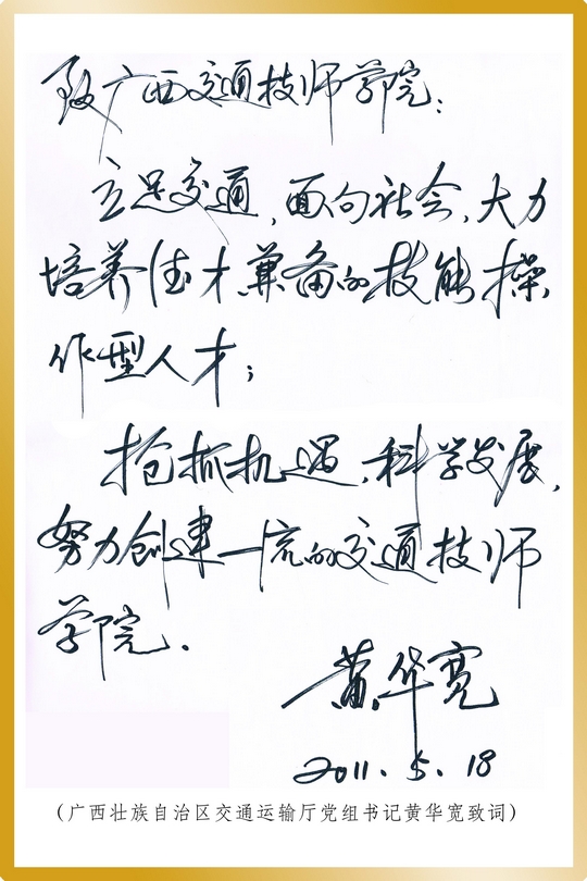 圖5 自治區交通運(yùn)輸(shū)廳黨組書記(jì)黃華寬為我校題詞