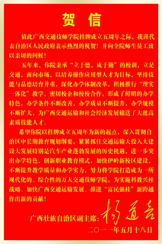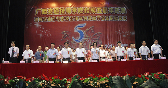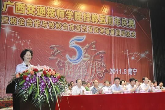 在這歡(huān)欣鼓舞的日子裏,上級主管部門及領導對我校五年來的發展成就給予了高度(dù)評價,新聞(wén)媒體(tǐ)和社會各界也(yě)對我校五年來的辦(bàn)學成果給予了高度關注。自治區副主席楊道(dào)喜向我校發(fā)來賀信,自治區交通(tōng)運輸廳黨組書記黃華寬為我校題詞,自(zì)治區交通運輸廳廳(tīng)長潘巍也(yě)為我校發來寄語。同時,自治區人力資源和社會保障(zhàng)廳副廳(tīng)長於祖毅、自(zì)治區交通運(yùn)輸廳副巡視員黃小幸、廣西(xī)陸軍預備役步兵師首長、自治(zhì)區道路運(yùn)輸管理局孫永生書記等領導以(yǐ)及各合作企業、院校、全(quán)區80所中學代表(biǎo)和各友鄰共建單位的領導、嘉(jiā)賓歡聚一堂,與我校(xiào)全體教職員工共同見證五周年慶典的美好時刻。