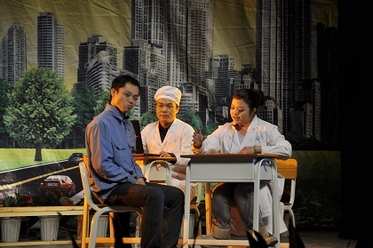 圖八:小品 《看病》劇照 表(biǎo)演者:汽車機電係 黎曉耘、勞(láo)一民、蔣濟隆老師