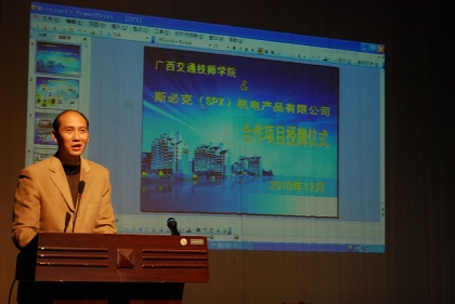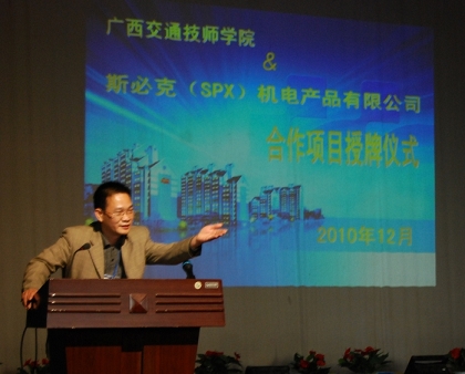 2010年12月17日,廣(guǎng)西交通高級技工學校/斯必克公司校企合作揭牌儀式在學校禮堂隆重舉行(háng)。中國汽車工(gōng)程學會汽車應用與服務分會副秘書長戴(dài)育紅女士、斯必克機電產品(蘇州)有限公司市場總(zǒng)監吳立新先生、項目經理喻學斌先生,我校(xiào)韋紅教校長、關菲明副(fù)校長等領導出席了揭牌儀式。