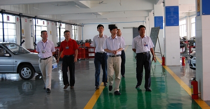 圖二:韋紅教校長(zhǎng)(左三)、鍾修(xiū)仁副校長(zhǎng)(右一)陪(péi)同(tóng)晏副(fù)總經(jīng)理(右(yòu)二)一行參觀學校汽車檢測維修實訓中心