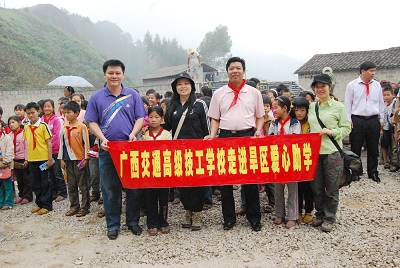 5月8日上午(wǔ),自治區人力資源和社會勞動保障廳於祖毅副廳長帶領91.com高級技工(gōng)學校、廣西石化高級技工學校、廣西柳州高級機(jī)械技工學校、廣西新(xīn)聞出技工學校、華南職業技術學校的代表,進入了地處邊遠山區的河池市環(huán)江縣洛陽鎮玉合村大吉礦產希望小學,舉行愛(ài)心助學(xué)捐(juān)贈儀式(shì)。