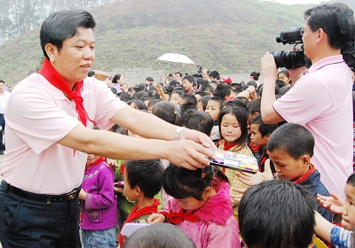 圖三(sān):我校鍾修仁副校長把文(wén)具、書本發(fā)送到學生手上