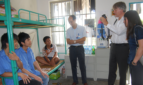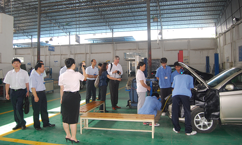 考察團一行到我校教(jiāo)室、實訓車間、食堂(táng)、學生宿舍(shě)等地參觀。在參觀我(wǒ)校實訓車間時,孫校長向德國專家詳細介紹了學校汽車專(zhuān)業實習設備及教學的相關情況。隨後,德國職(zhí)業(yè)教育集團主席到學生宿舍參觀(guān),同我校學生親切交談並合影留念。